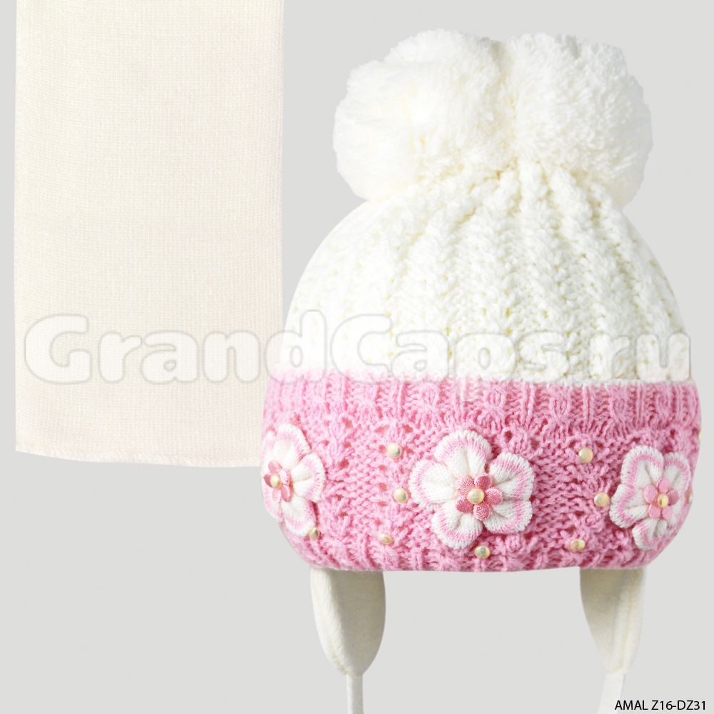 Amal Z16-DZ31 - это очаровательный комплект на малышку в возрасте от 9 месяцев до 1.5 лет. Для головного убора использована нежная пряжа двух сочетающихся пастельных тонов. Шапка связана несколькими узорами, что подчеркивает оригинальность ее стиля. Отворот шапки украшен вышитыми цветами и блестящей фурнитурой. В верхней части прикреплены два помпона из пряжи.
