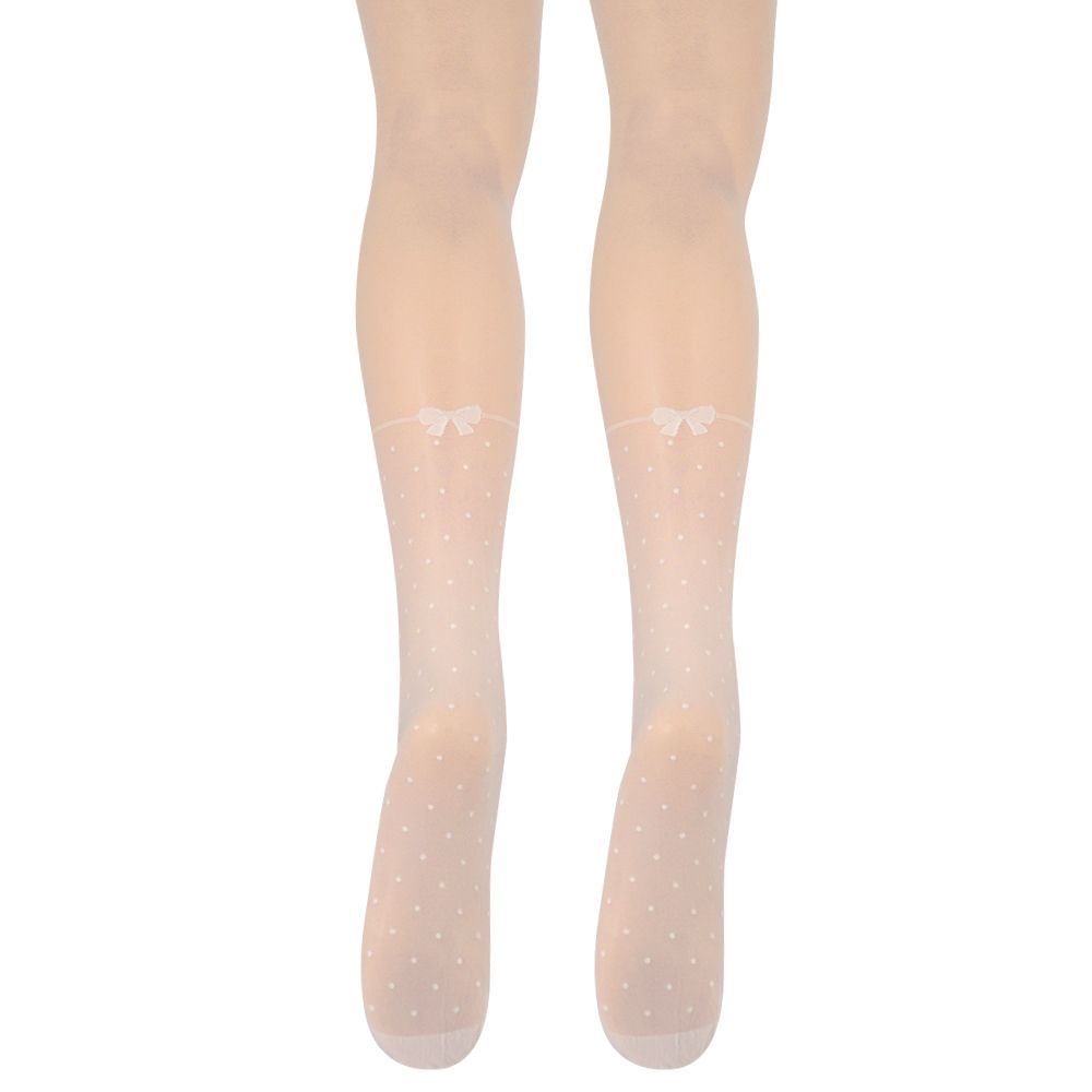 Тонкие и эластичные колготки с имитацией гольфов в горошек. Удобный эластичный пояс, торс в виде ажурных трусиков, комфортный плоский шов.