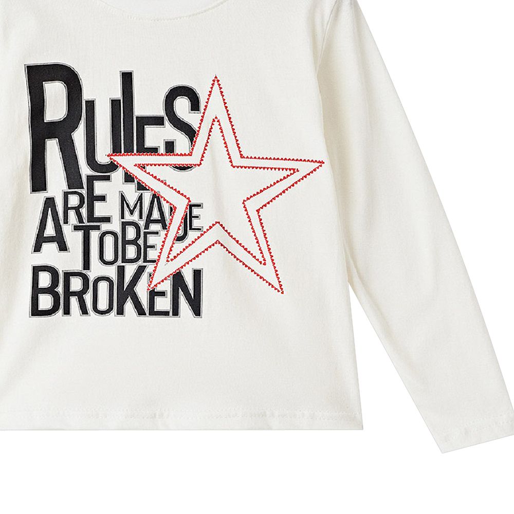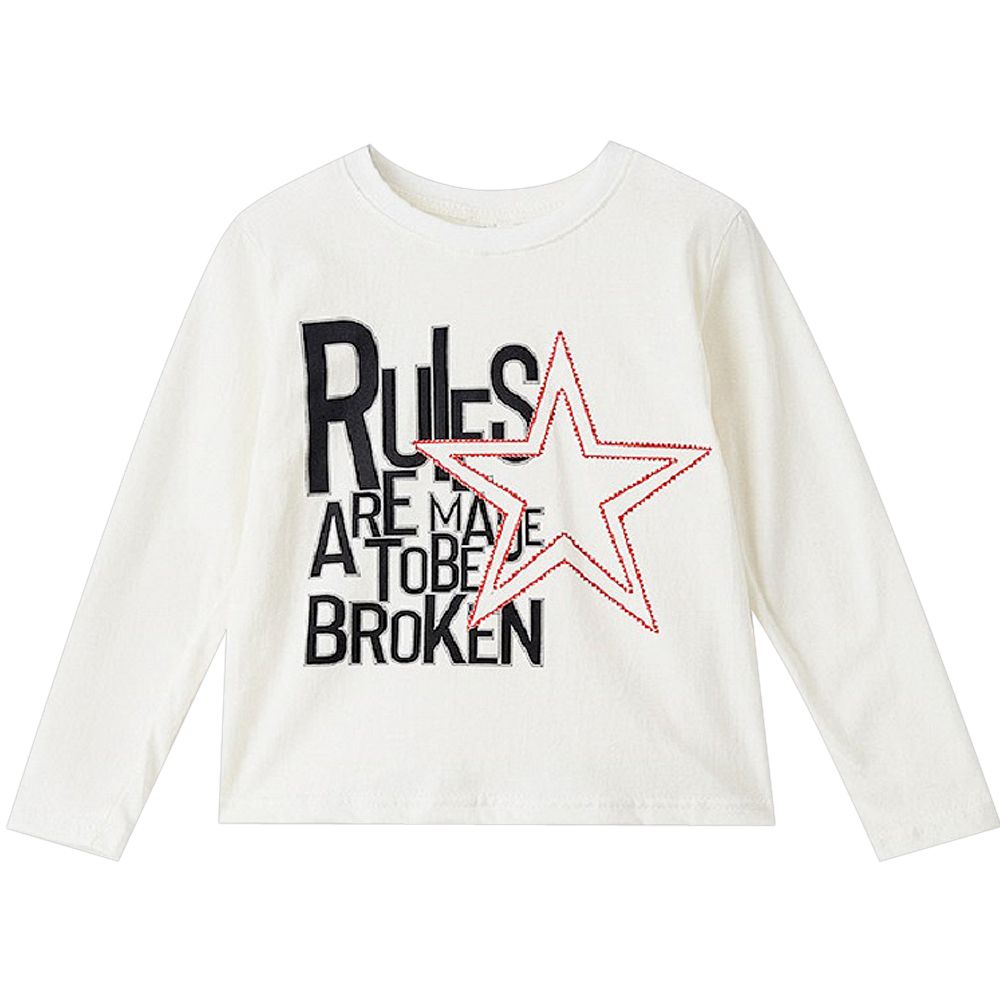 Стильный лонгслив из хлопкового трикотажного полотна, украшенный принтом и надписью "Правила созданы для того, чтобы их нарушать", придется по вкусу тем, кто любит смелые решения. Для создания завершенного образа модной красотки рекомендуем к покупке брюки Bonito Kids арт.OP671Б и бейсболку Magrof арт.K2888.