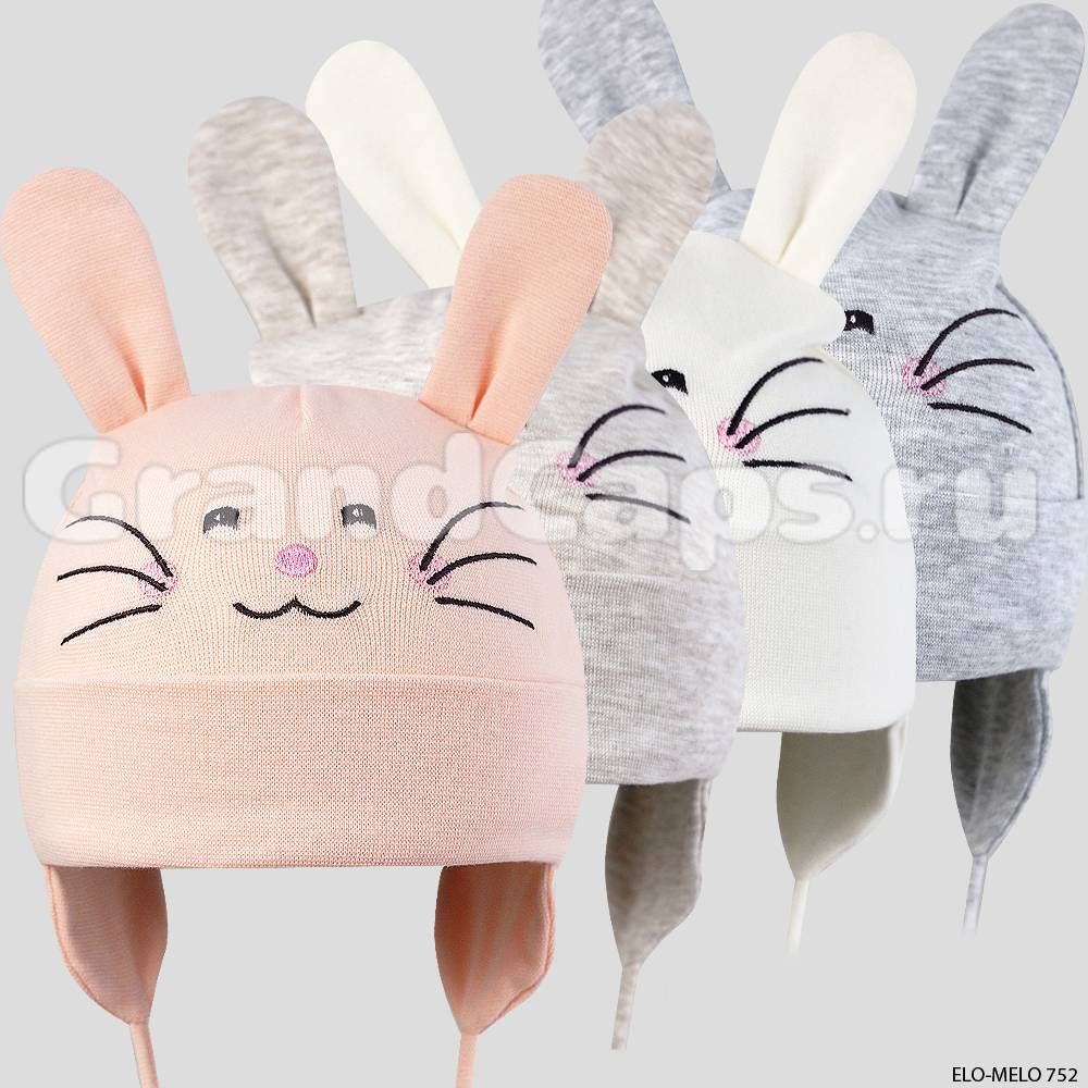 Шапка для девочки с имитацией ушек и мордочкой кролика, на завязках.