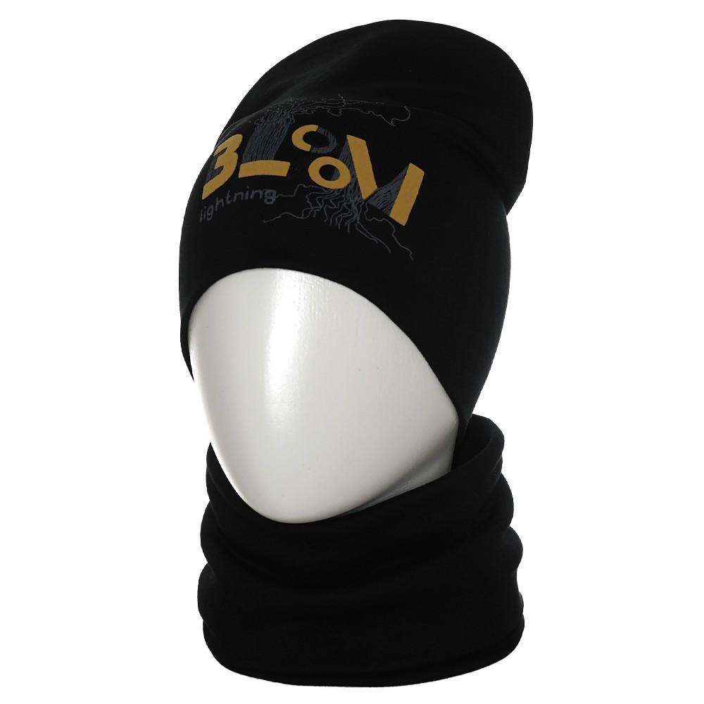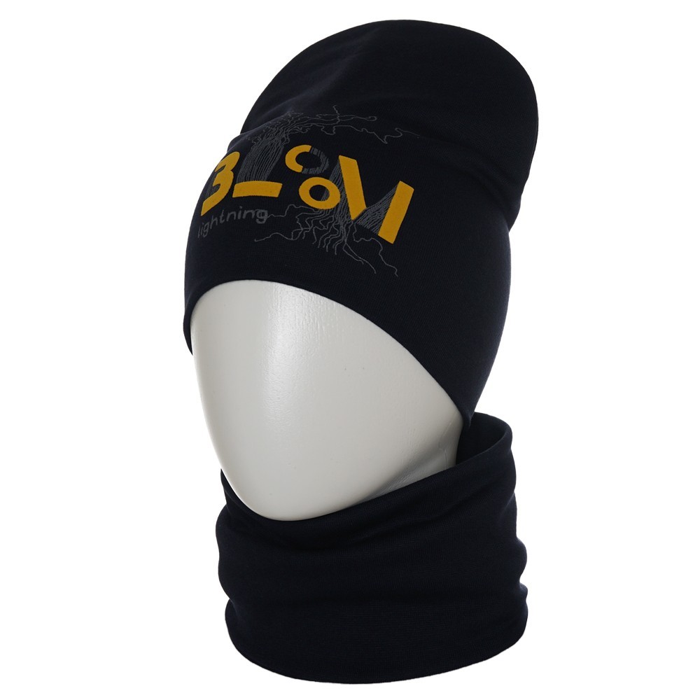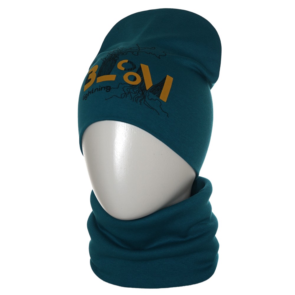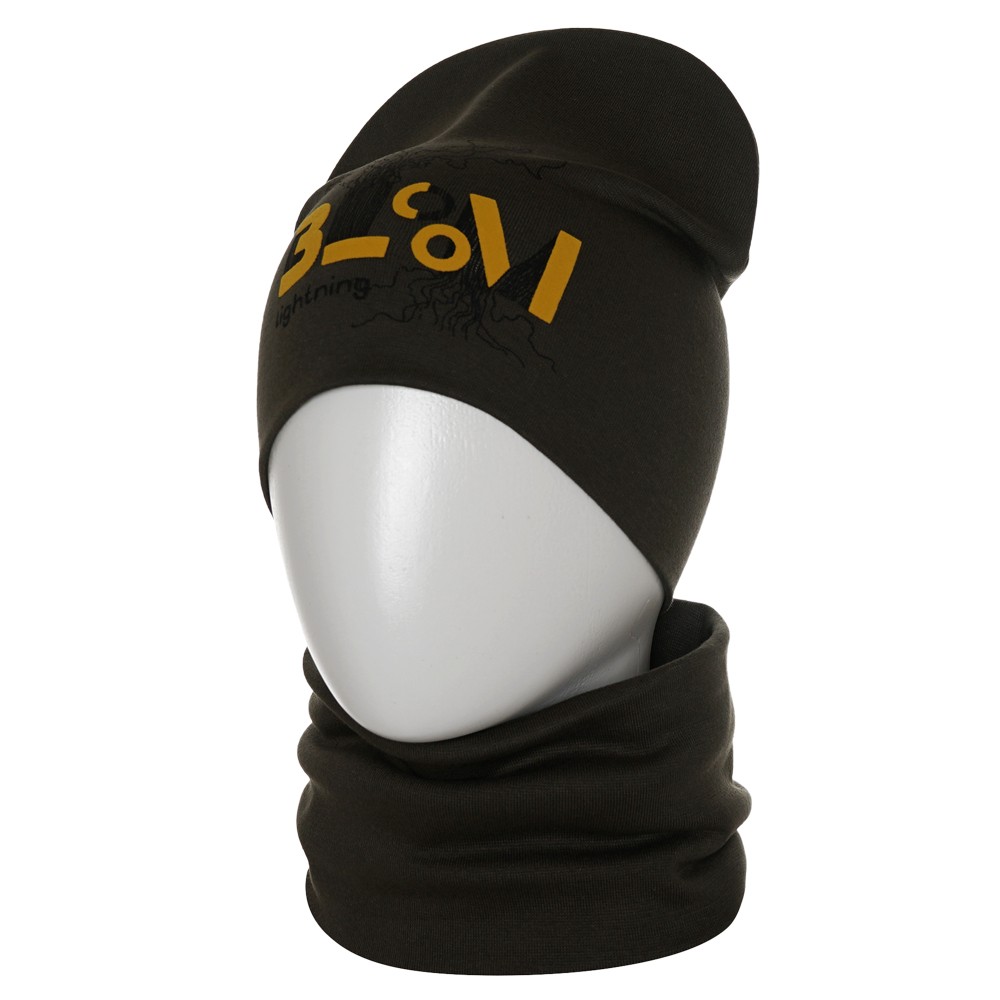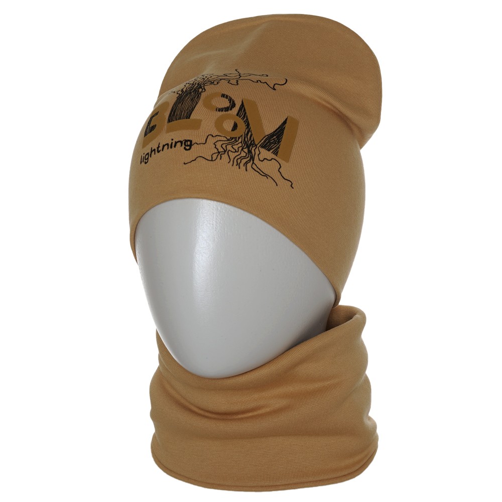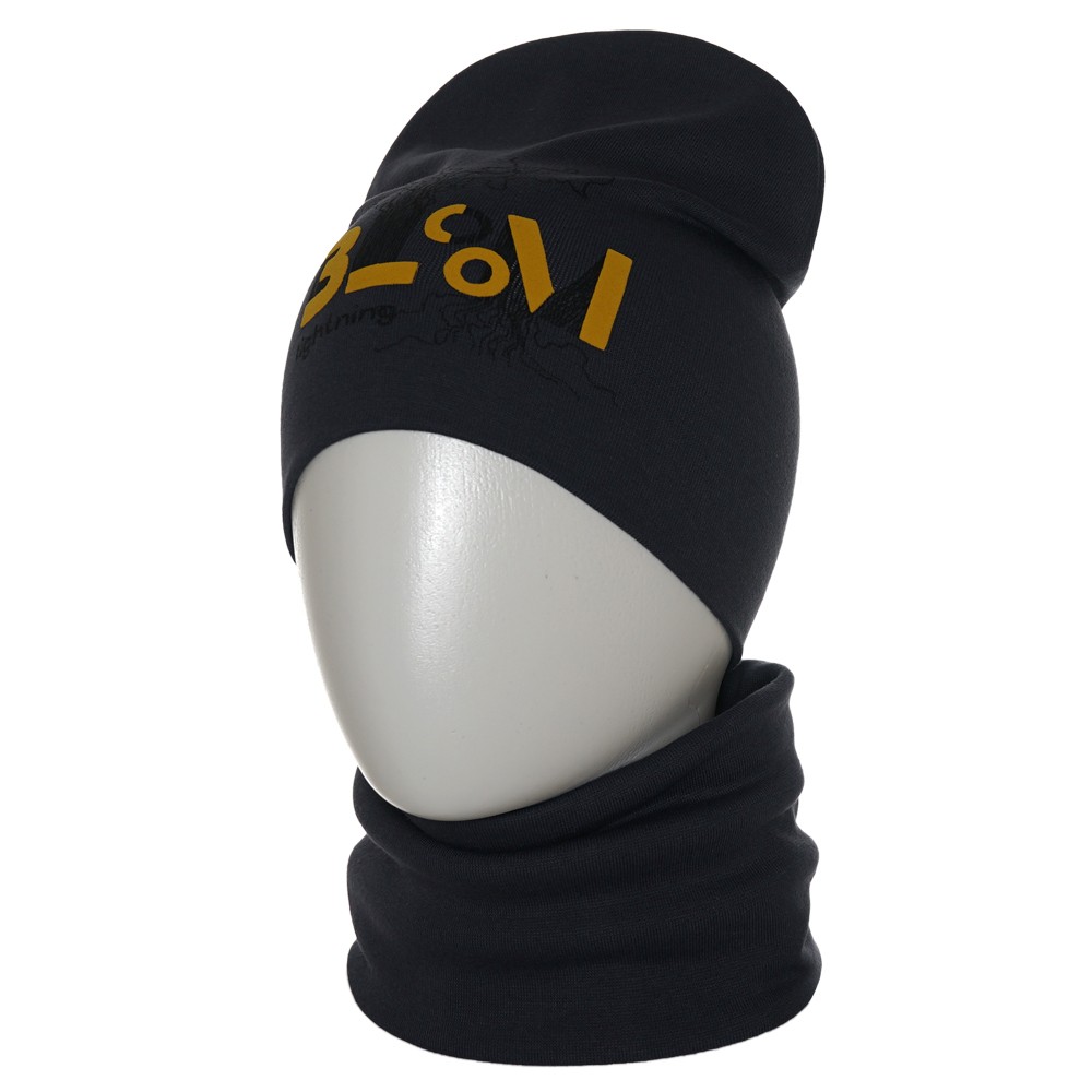 Стильная шапка и снуд для мальчика из мягкого хлопкового трикотажа с принтом, нанесенным краской высокой износостойкости, которая не трескается при длительном растяжении и не портится при стирке. Модель хорошо тянется и предполагает неплотную посадку по форме головы.
