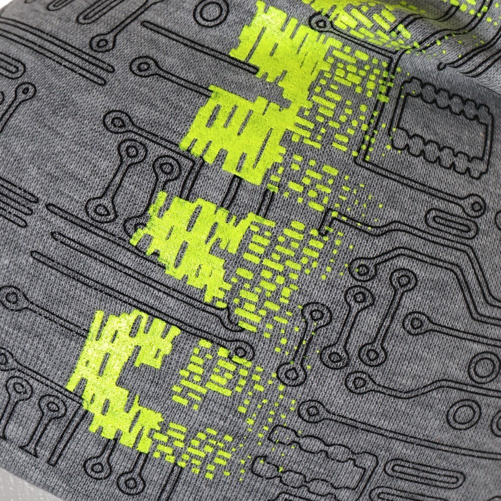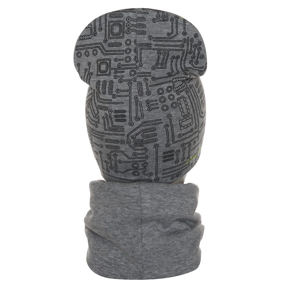 Стильная шапка и снуд для мальчика из мягкого хлопкового трикотажа с принтом, нанесенным краской высокой износостойкости, которая не трескается при длительном растяжении и не портится при стирке. Модель хорошо тянется и предполагает неплотную посадку по форме головы.