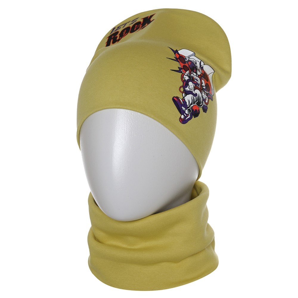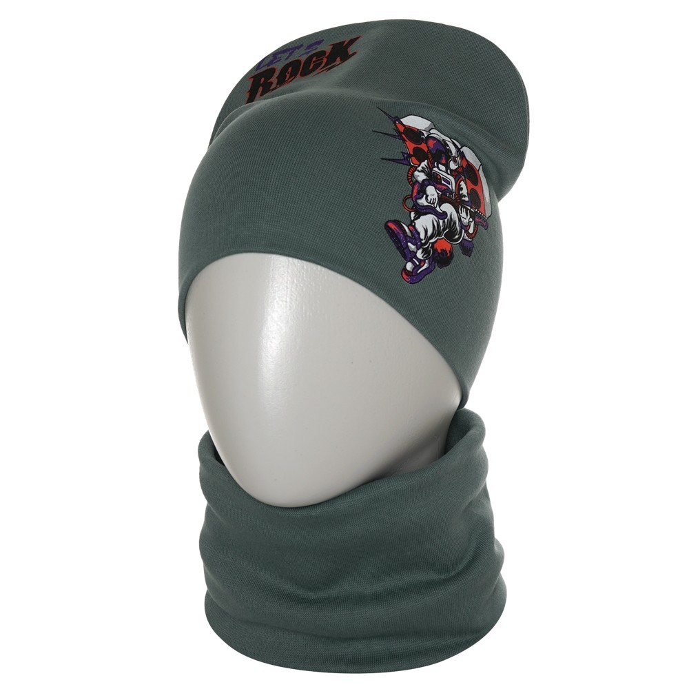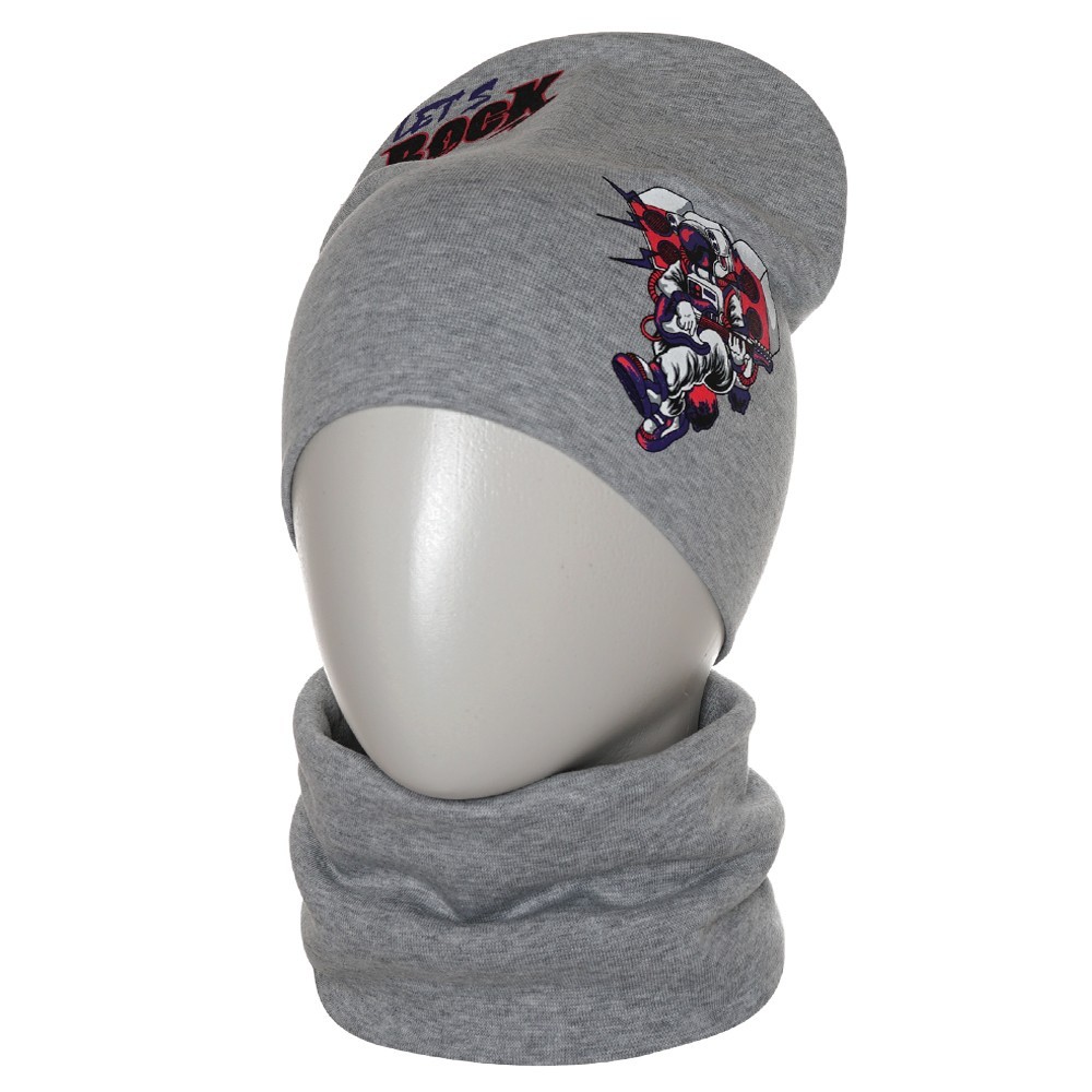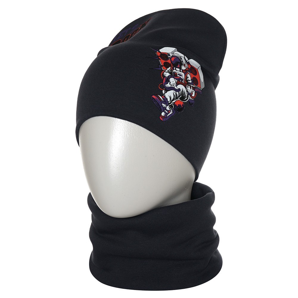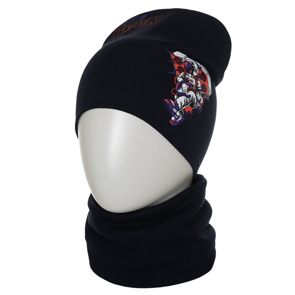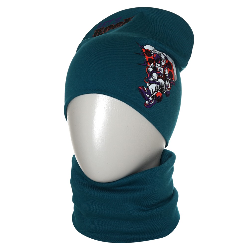 Стильная шапка и снуд для мальчика из мягкого хлопкового трикотажа с принтом, нанесенным краской высокой износостойкости, которая не трескается при длительном растяжении и не портится при стирке. Модель хорошо тянется и предполагает неплотную посадку по форме головы.