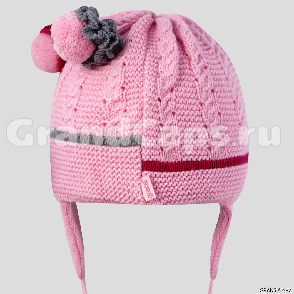 Комплект для девочки с помпонами, оформлен вязаными бантиками, на завязках.