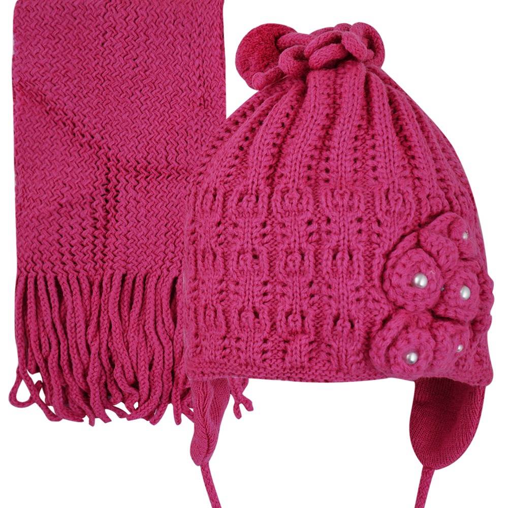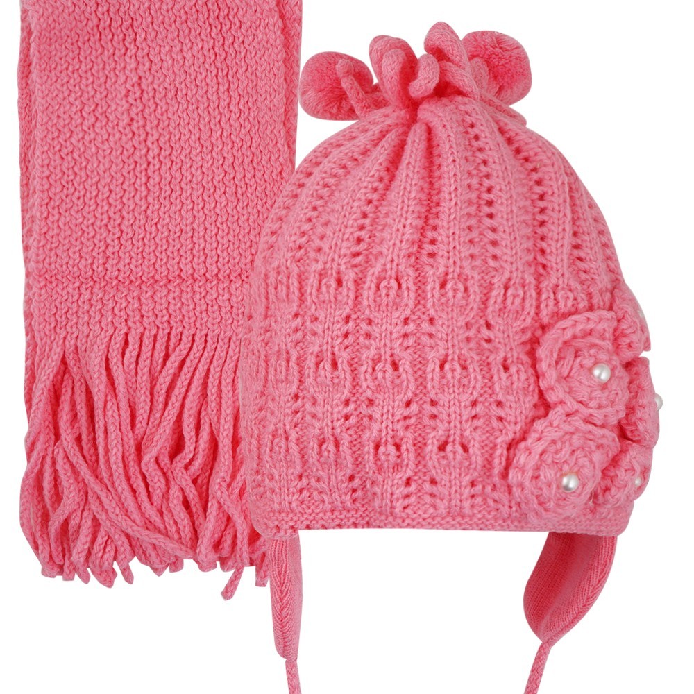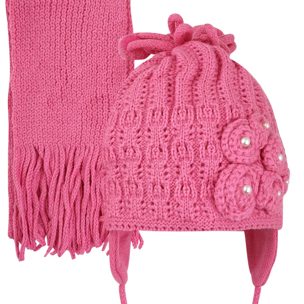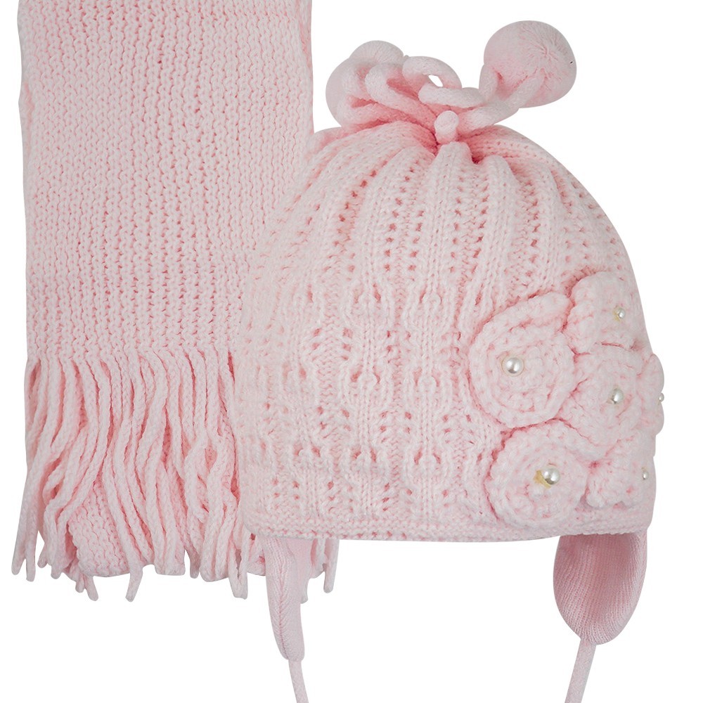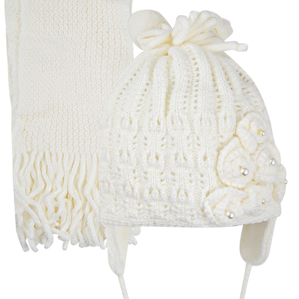 Комплект для девочки с помпонами, оформлен декоративными цветками, на завязках.