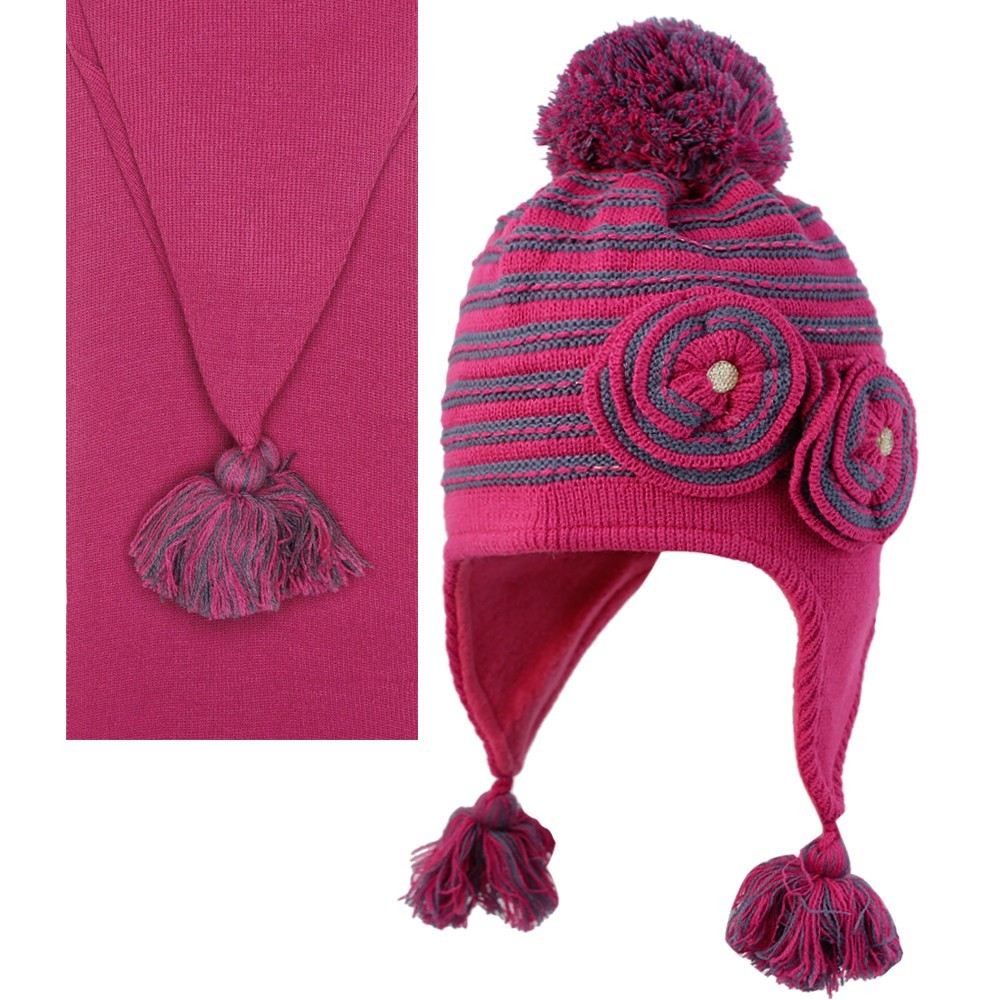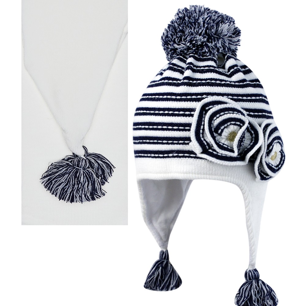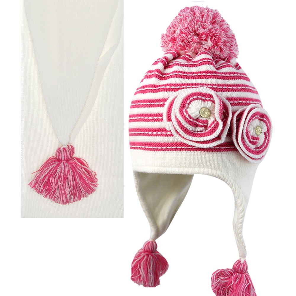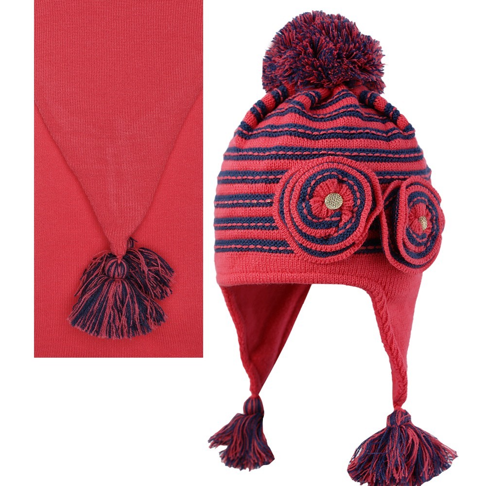 Комплект для девочки с помпоном, отделка в виде декоративных цветков, на завязках с кисточками.