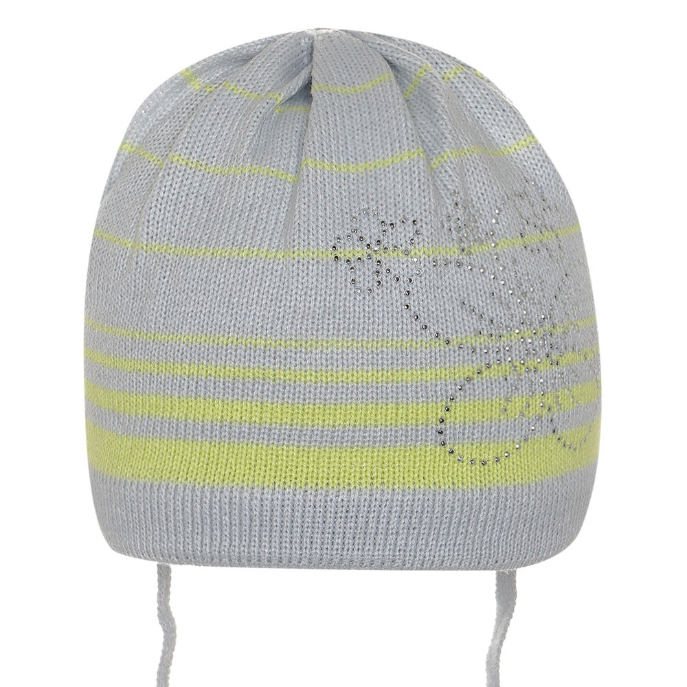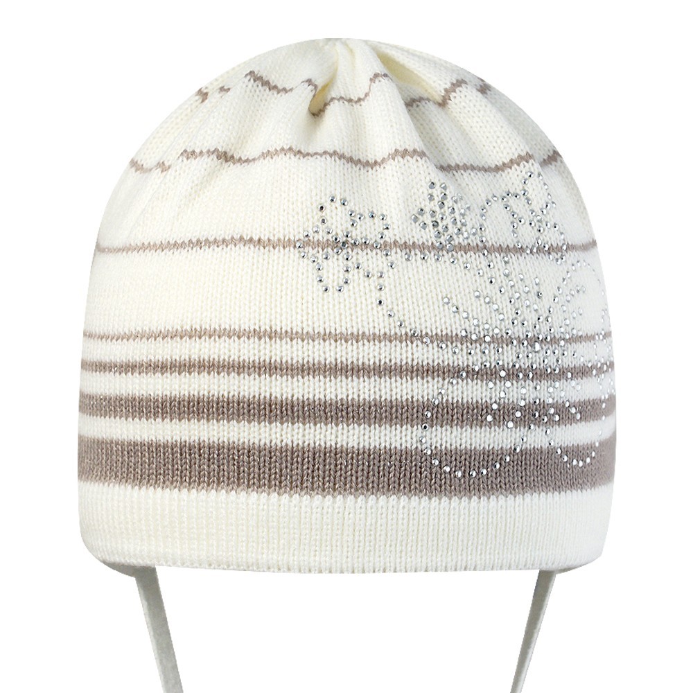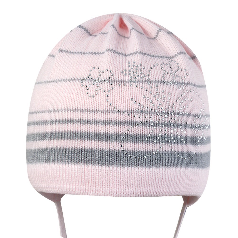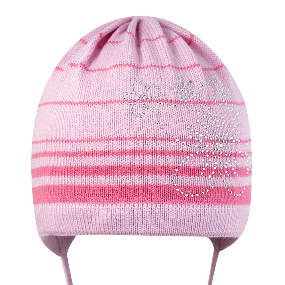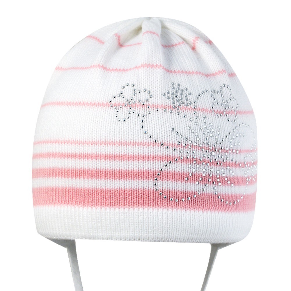 Шапка для девочки в полоску с бабочкой из страз, на завязках.