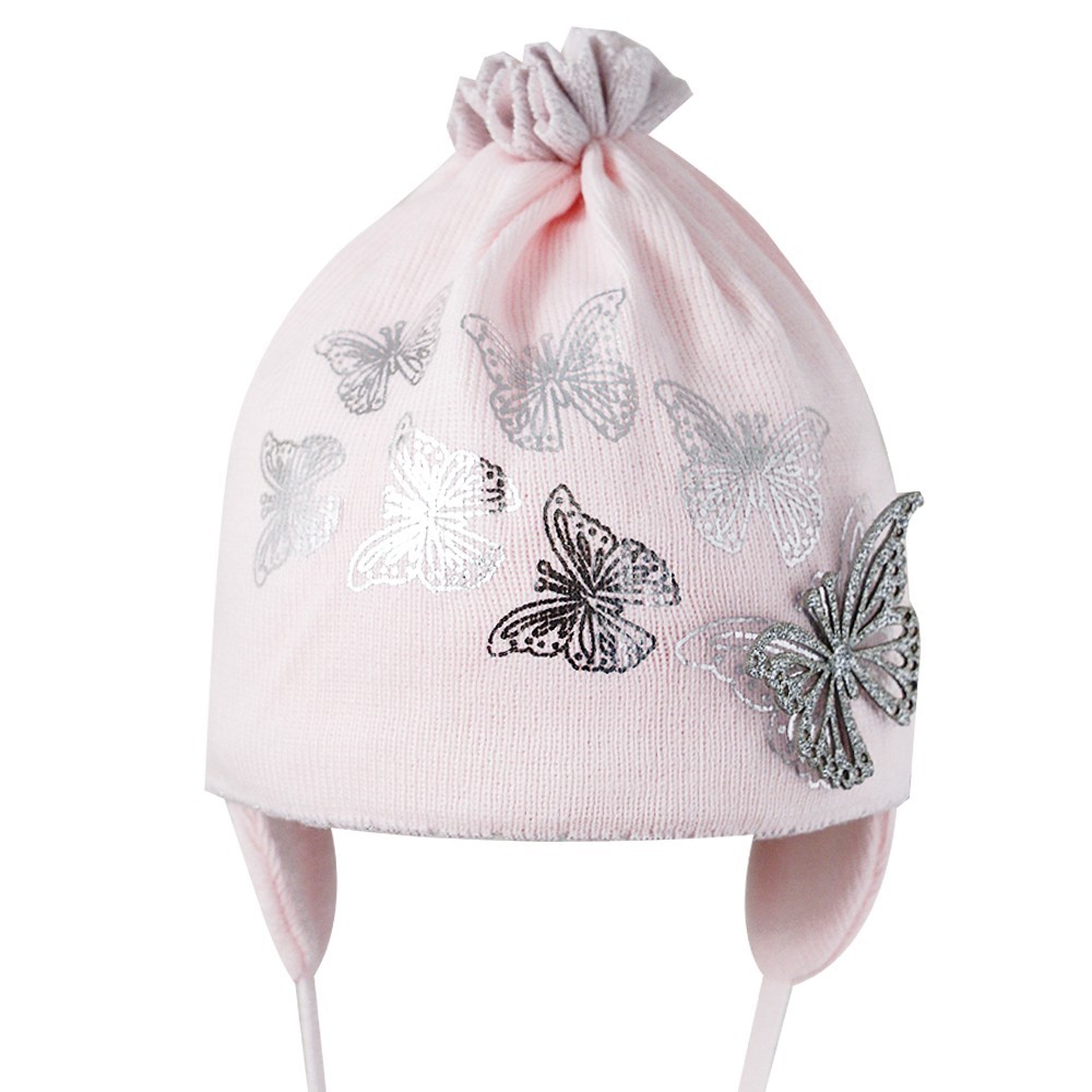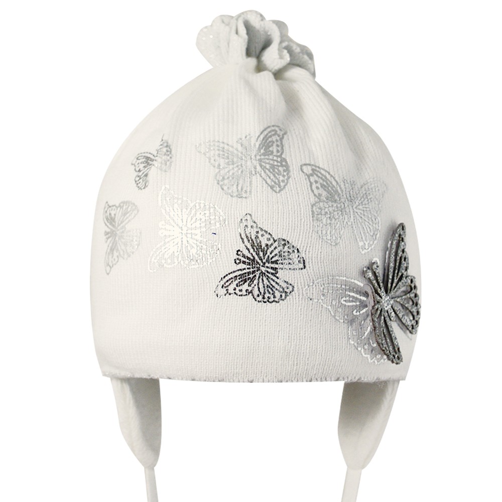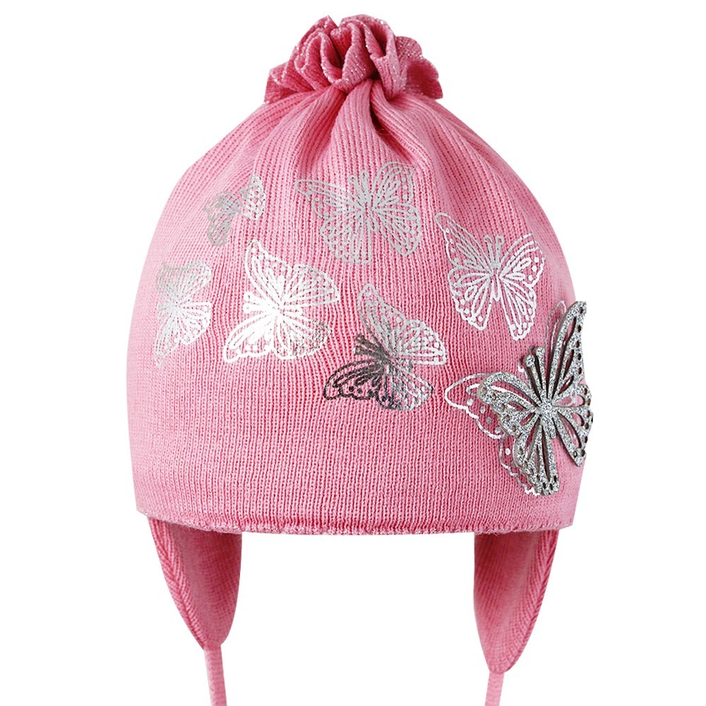 Шапка для девочки с принтом из бабочек и декоративной бабочкой, на завязках.