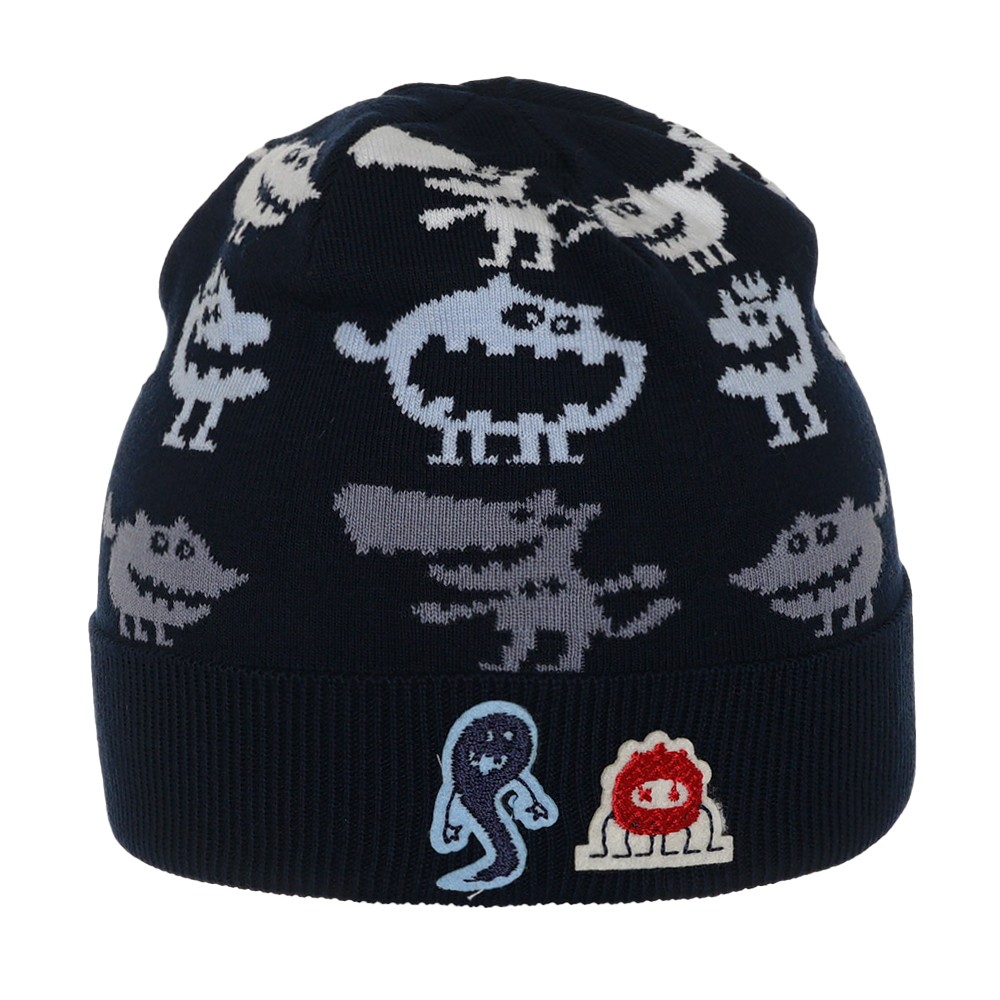 Шапка для мальчика с жаккардным рисунком и нашивками на отвороте.