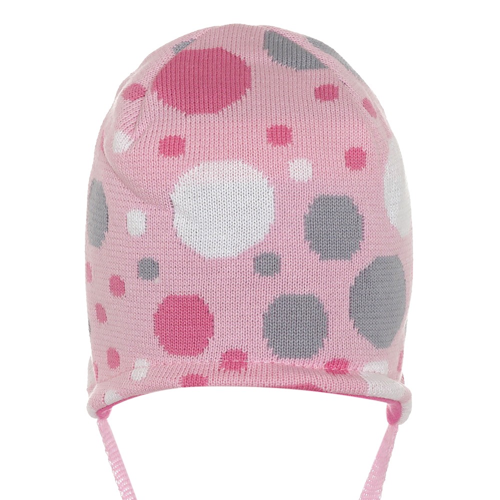 Оригинальная шапочка для девочки с жаккардым рисунком пузырьков и нашивками в виде рыбок, на завязках.