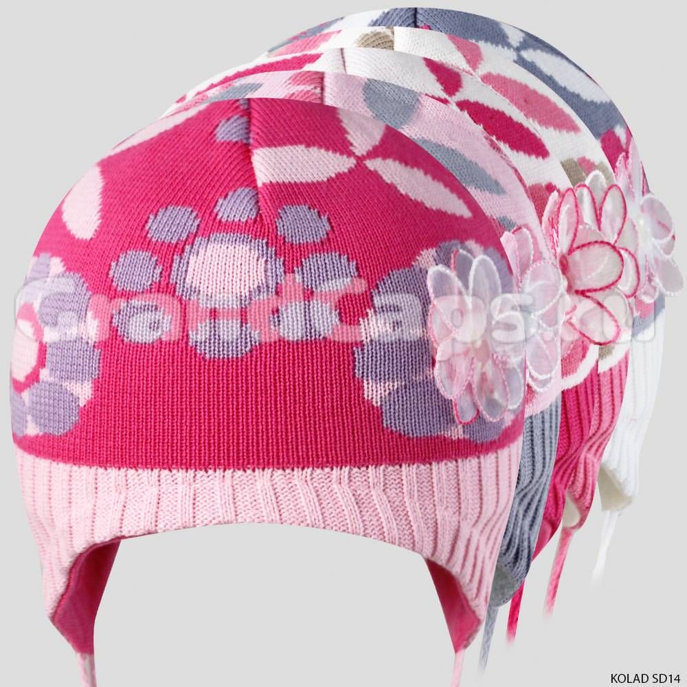 Шапка для девочки с жаккардным рисунком и декорированным цветком.