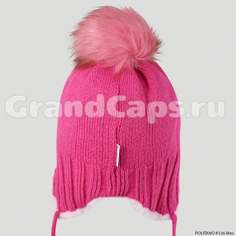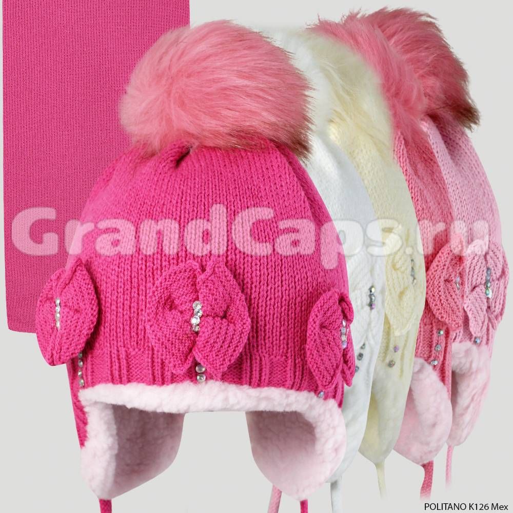 Вязаная шапка для девочки на завязках, с помпоном из искусственого меха, с бантиками и стразами. подкладка из искусственного меха.
