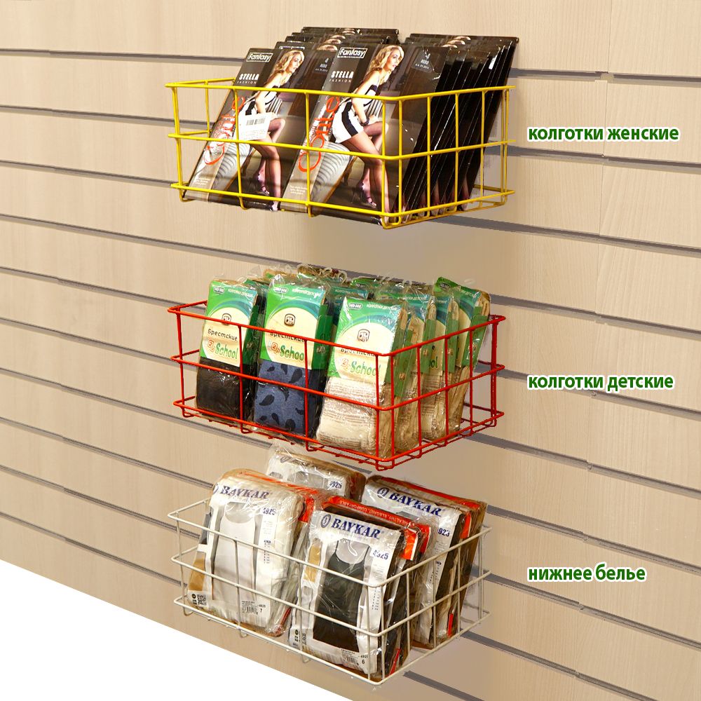Оборудование из металлических прутьев, предназначенное для экспонирования различных непродовольственных товаров (носки, колготки, белье). Длина 395 мм, ширина 250 мм, высота 150 мм.