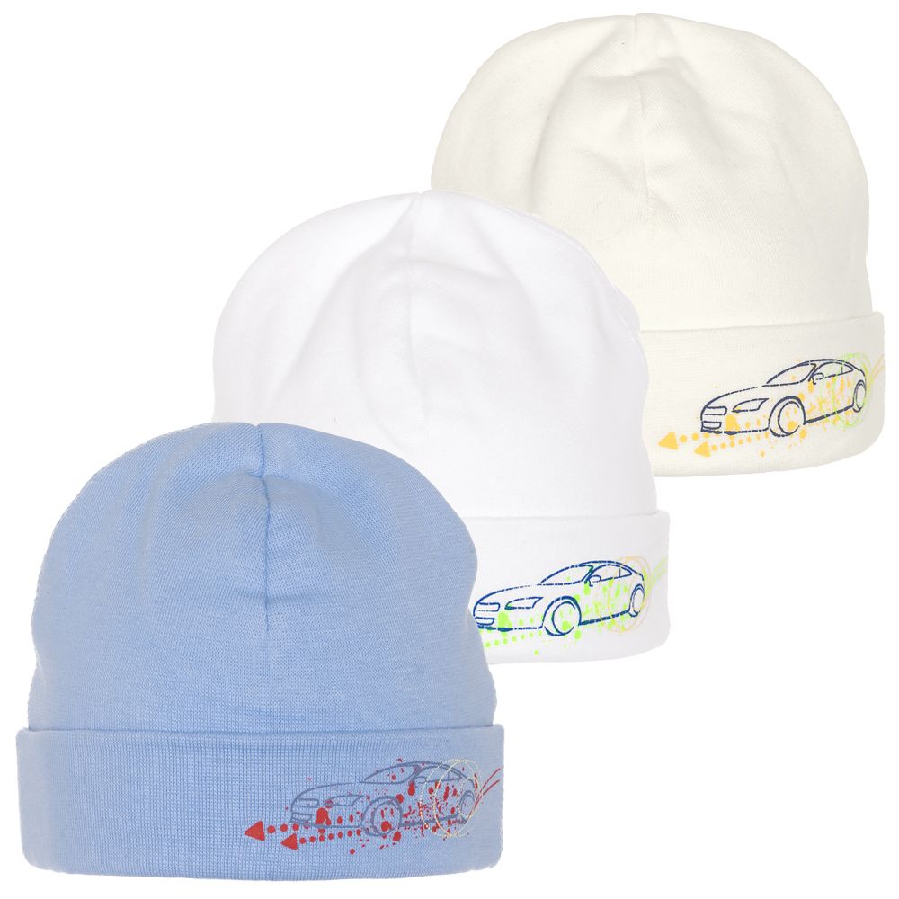 Шапочка для мальчика с отворотом и рисунком напечатанной машинки.