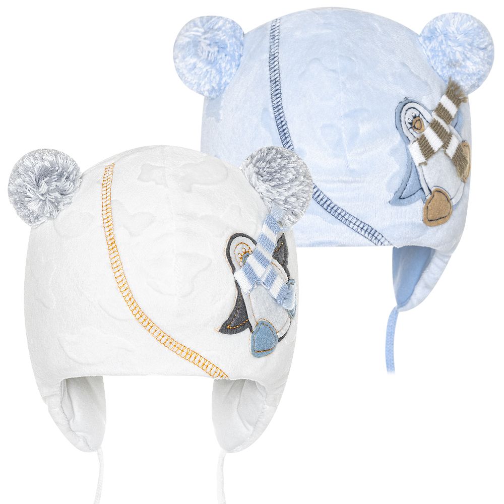 Шапка для мальчика на завязках с 2 нитевыми помпонами по боках от макушки и аппликации "пингвин в шарфе".