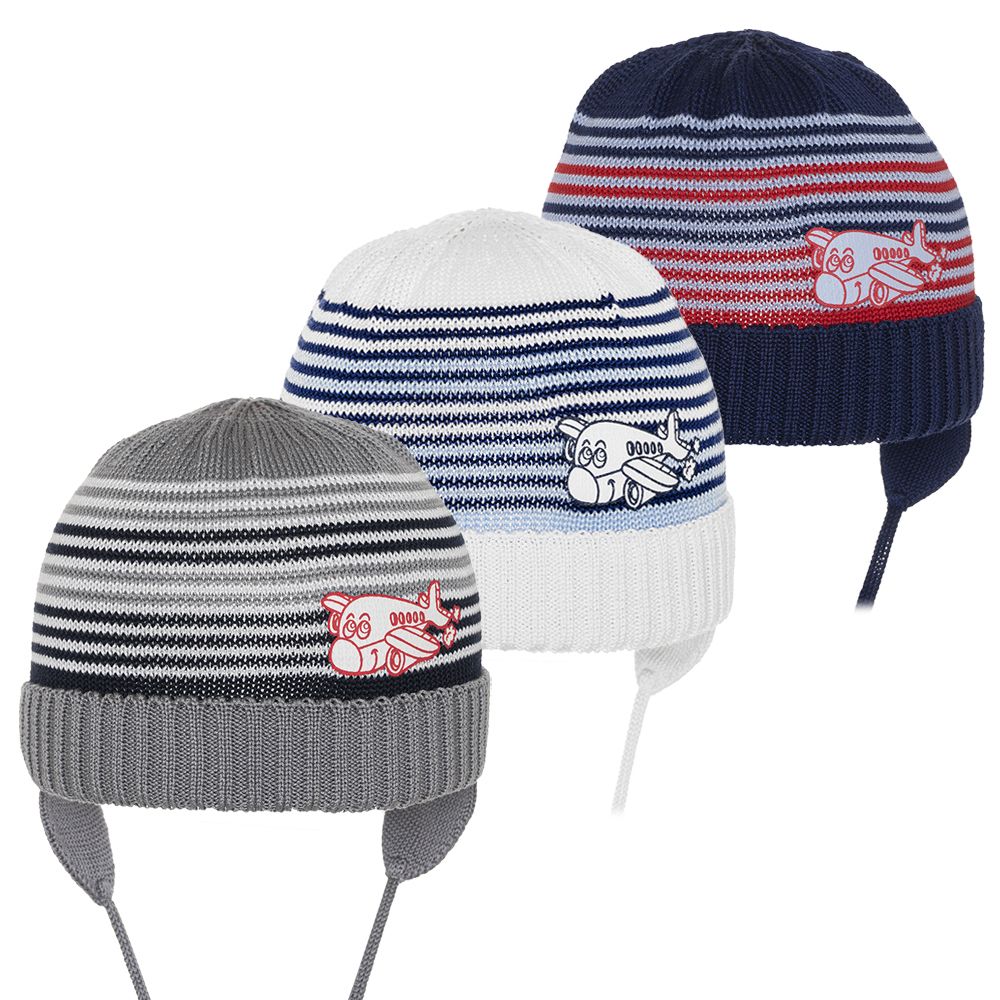 Шапочка вязаная в полоску на мальчика с отворотом на завязках и нашивным самолетом.