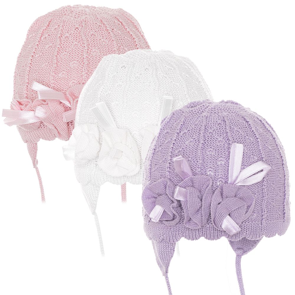 Шапочка на девочку ажурной вязки на завязках, с декоративными цветками.